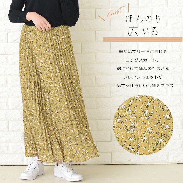 プリーツスカート レディース ロング丈 ボトムス 透け 薄手 きれいめ カジュアル シンプル フェミニン ガーリー ナチュラル 花柄 総柄 かわいい おしゃれ ネイビー ブラック ホワイト ブルー レッド ブラウン イエロー ベージュ マスタード カーキ ピンク グレー