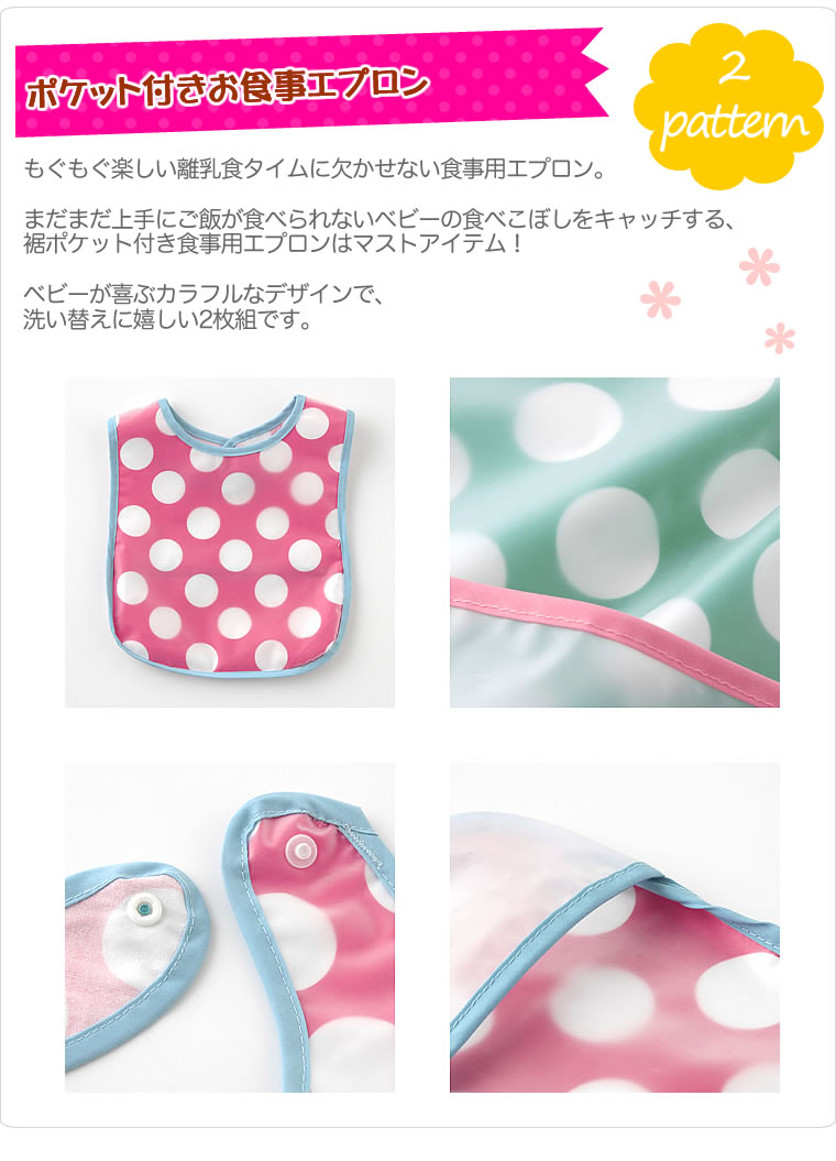 まだまだ上手にご飯が食べられないベビーの食べこぼしをキャッチする、裾ポケット付き食事用エプロンはマストアイテムです! ベビーが喜ぶカラフルなデザインで、 洗い替えに嬉しい2枚組です。