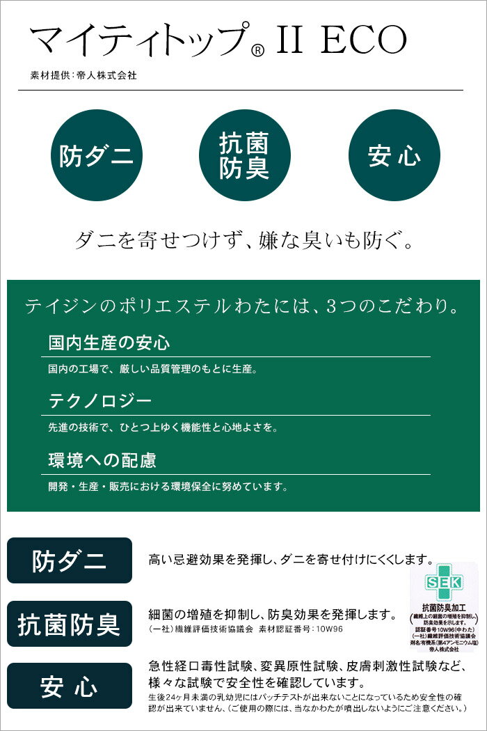 中わたに防ダニ・SEK抗菌防臭加工を施しているテイジンの清潔わた「マイティトップ®II ECO」を使用!ダニを寄せつけず嫌な臭いも防ぎます。