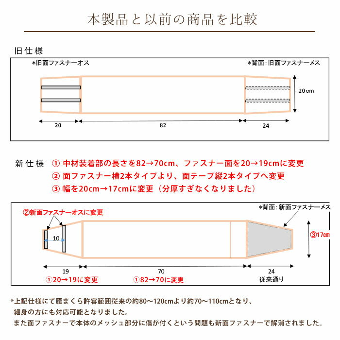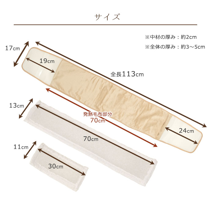 *Fine-Airシリーズはこちらから ■名称:温熱腰まくら ■サイズ カバー:幅17×長さ113cm(発熱毛布部分:70cm) 中材(大):幅13×長さ70×厚み約2cm 中材(小):幅11×長さ30×厚み約2cm 中材装着時の厚み:約3〜5cm ■組成 (側地) 表面:ハニカムメッシュ(ポリエステル100%) 裏面:発熱毛布(ポリエステル100%) 中層フィルム(ポリウレタン) (中材) エアーラッセル®(ポリエステル100%) ■製品重量:約270g ■日本製 ■お手入れ・ご使用上の注意 【側地】 洗濯の際はネットのご使用をおすすめします。