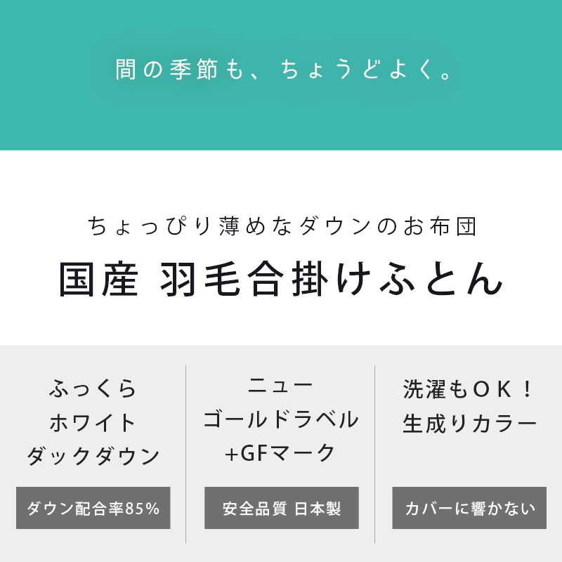 サイズ一覧 SL SDL DL keyword | 肌布団 はだふとん 肌ぶとん 春ふとん 春ぶとん 春布団 薄手 春夏用 夏用 夏 秋用 秋 羽毛 ダウンケット 春の羽毛 夏の羽毛 秋の羽毛 季節の変わり目 ダウン85 ニューゴールドラベル ゴールドラベル GFマーク 寝冷え 寒がり 冷え性 無地 生成り Plainシングルロング|約150×210cm ※写真はイメージです。