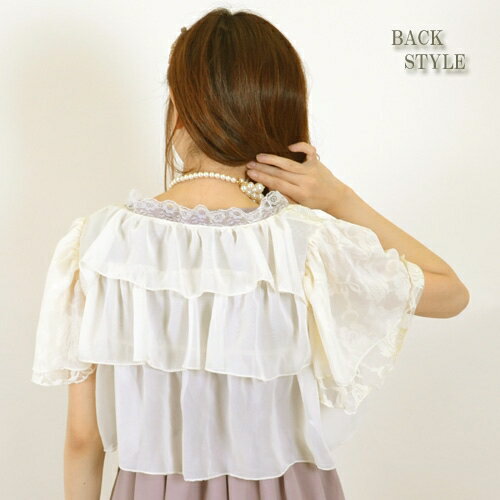 背中にフリルたっぷりのゆったりボレロ 着丈 33cm バスト 90cm 袖丈 22cm ポリエステル100% 中国製 ・肩と袖の切替がないので、ゆったりお召し頂けるボレロです。