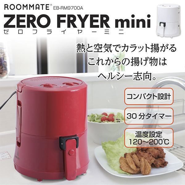 【仕様】 ・電源:AC100V 50/60Hz ・消費電力:1000W ・温度ヒューズ:192℃ ・安全装置:異常加熱防止装置、安全スイッチ ・製品サイズ:約 幅21.4×奥行22.9×高さ26.7cm ・製品重量:約 2.8kg ・コードの長さ:約150cm 【付属品】 ・フライバスケット ・バスケットパン ・本体台座 ・取扱説明書 ・保証書熱と空気でカラッと揚がる!ZERO FRYER mini ゼロフライヤーミニ EB-RM9700A※メーカー保証あり。